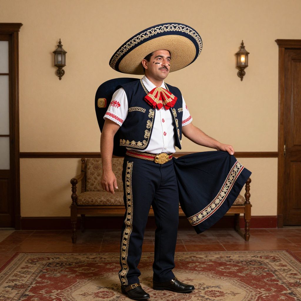 Photograph of a man in traditional Mexican attire standing in a warmly lit room. He wears a large, wide-brimmed sombrero with intricate white embroidery, a white shirt with red and white striped sleeves, a black vest adorned with gold and white patterns, and black pants with matching gold embroidery on the sides. A red ribbon is tied around his neck. He holds a black shawl with white trim in his right hand. The background features beige walls, two wooden doors, and two ornate wall sconces. An upholstered bench with a patterned fabric sits against the wall. The floor has a red and beige patterned rug.