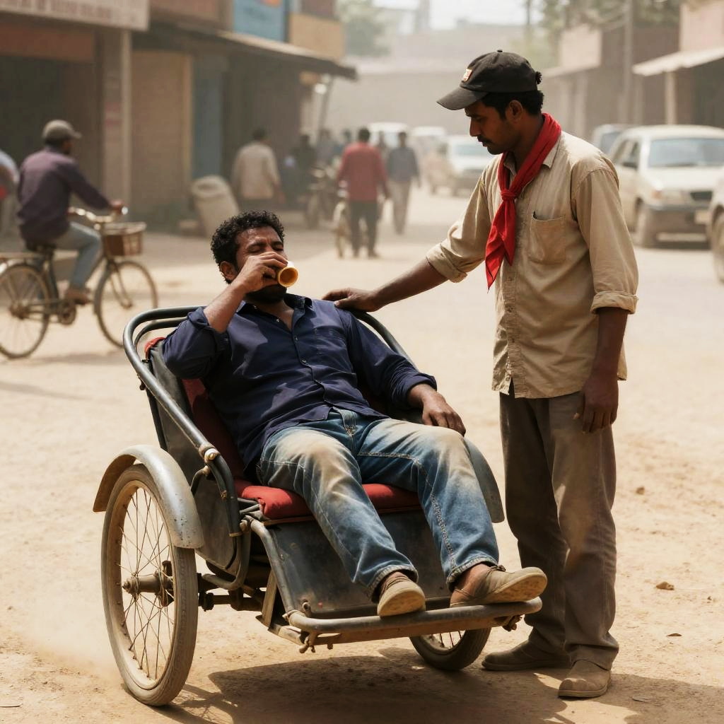 Three men on a city street during daytime with an overcast sky. Central man, overweight, wearing brown jacket and pants, is seated playing a large drum with drumsticks. A man in a blue jacket and cap is crouched nearby looking down. Another man in a white t-shirt and brown pants stands observing. The scene includes a blue and a white car, both damaged, with one partially visible and broken bottles scattered on the road. Residential buildings with barred windows and balconies are in the background.