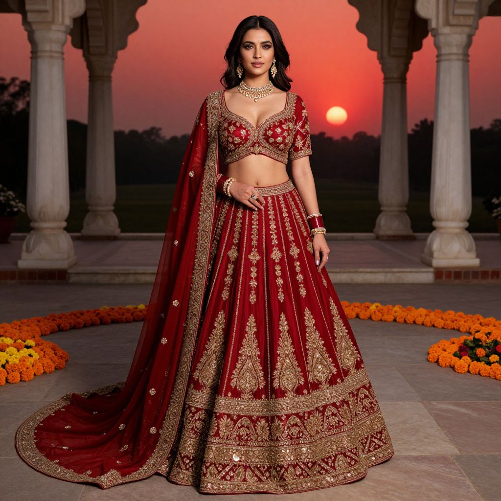 A stunning woman with deep brown eyes, warm skin tone, and a graceful facial structure wearing a heavy engagement lehenga in rich crimson red with gold zari embroidery, standing in a traditional Indian courtyard under a red sunset, with marble pillars and blooming marigolds in the background, detailed fabric textures and voluminous train flowing behind her, costume-focused realism, high-resolution photography. The woman has big breasts and cute face