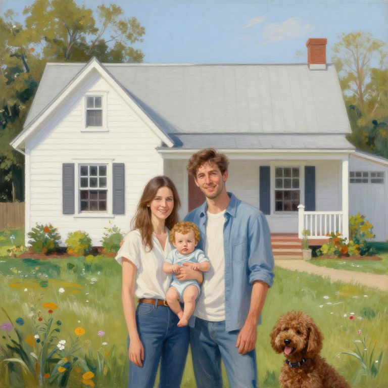 Painting of a hipster mom, hipster dad, curly headed baby and brown poodle in front of a white single story 1950's farm house, in the style of thomas kinkade