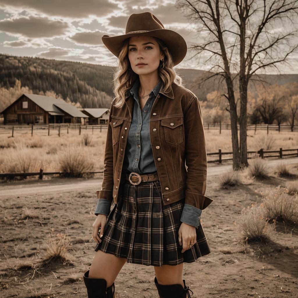 Photo of a Proportionate Body woman, Wavy Lob, cowgirl outfit ideas, Western style with a Cinnabar cowboy hat, Denim jacket, Sepia plaid shirt, Suede skirt, leather boots, Urban outdoor scene, bildklusive naturalist film
