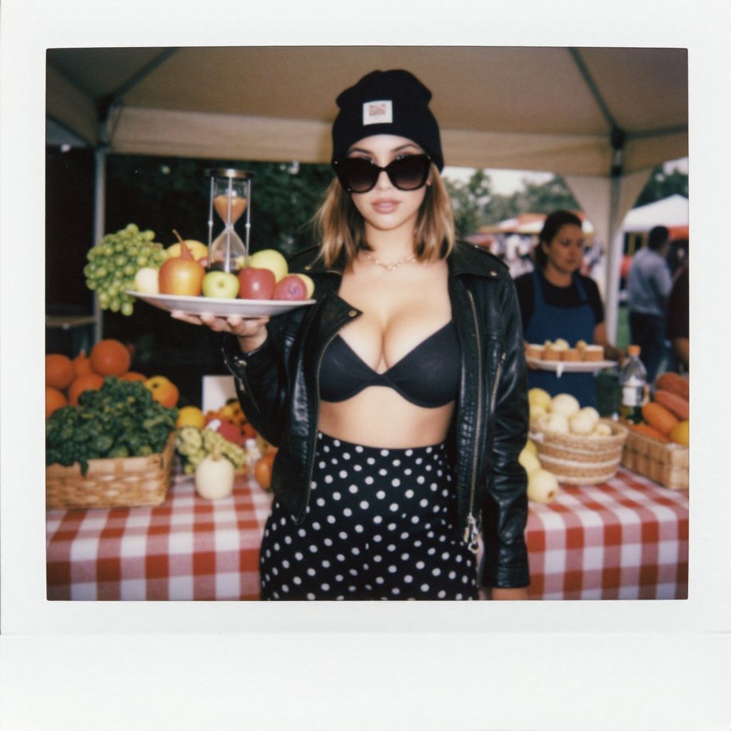 A Hourglass woman in a black leather jacket and high-waisted polka dot trousers stands confidently at a Seasonal Farm Feast, holding a plate of fresh produce. The scene is captured in a polaroid instant camera style, showcasing her dark beanie and oversized sunglasses as she enjoys the vibrant atmosphere. Sexy. Pretty face and beаutiful eyes. Big breasts