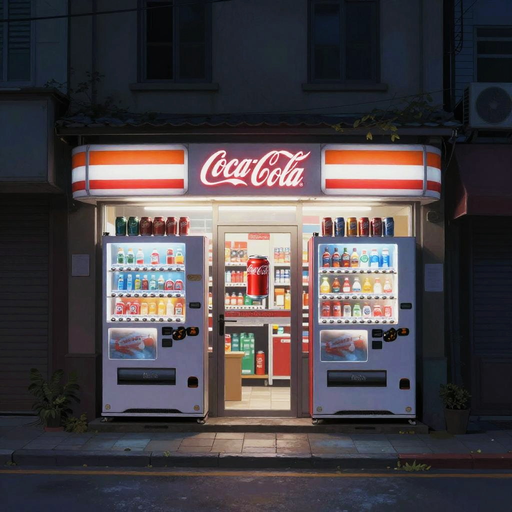 (masterpiece, best quality:1.2), ultra detailed, cinematic lighting, HDR, ilustration, corner store, shop, no humans, scenery, vending machine, convenience store, outdoors, window, building, storefront, coca-cola, night, road, street, door, alley, sign, can