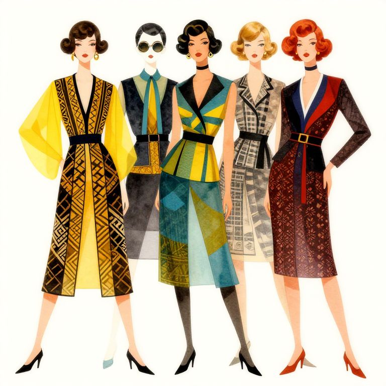 Vintage-style illustration of five stylish women in 1930s-inspired clothing, featuring bold patterns, bright colors, and high heels, standing together.