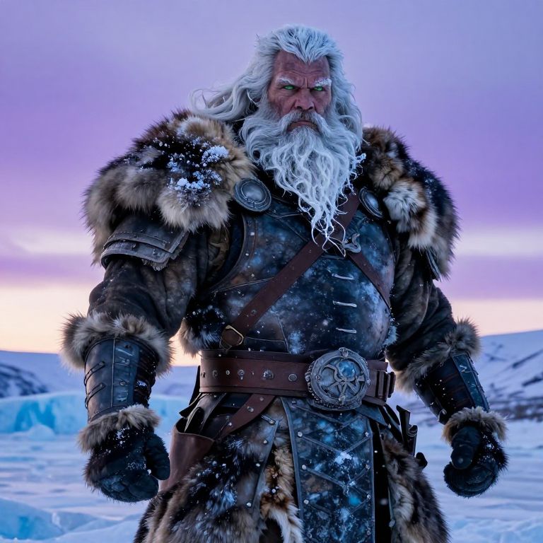 A rugged Nordic ice warrior standing on a frozen glacier at dawn, wearing heavy fur armor lined with ice-blue wax and reinforced with iron bands, his broad face weathered by cold winds, sharp green eyes glowing in the pale light, long white beard frosted with frost, powerful muscles defined by the cold, the sky streaked with icy violet hues behind him, snow falling softly around his massive form.