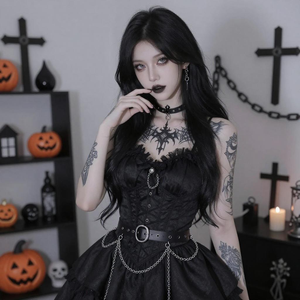 A gothic woman with long black hair and pale skin sits on a rock in a forest. She wears a black dress, sheer black stockings with floral patterns, and a red rose in her hair. She holds a rose stem near her mouth, with a chain belt around her waist. The background features tall, leafless trees and a forest floor covered in brown leaves.