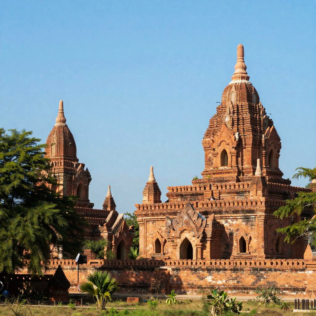 Photograph of ancient, reddish-brown brick temples with pointed spires under a clear blue sky. The temples are surrounded by lush green trees and grassy field. The largest temple is on the right, with smaller ones on the left and center. The sunlight highlights the temple's textures and details, creating a warm, vibrant contrast with the greenery and blue sky.