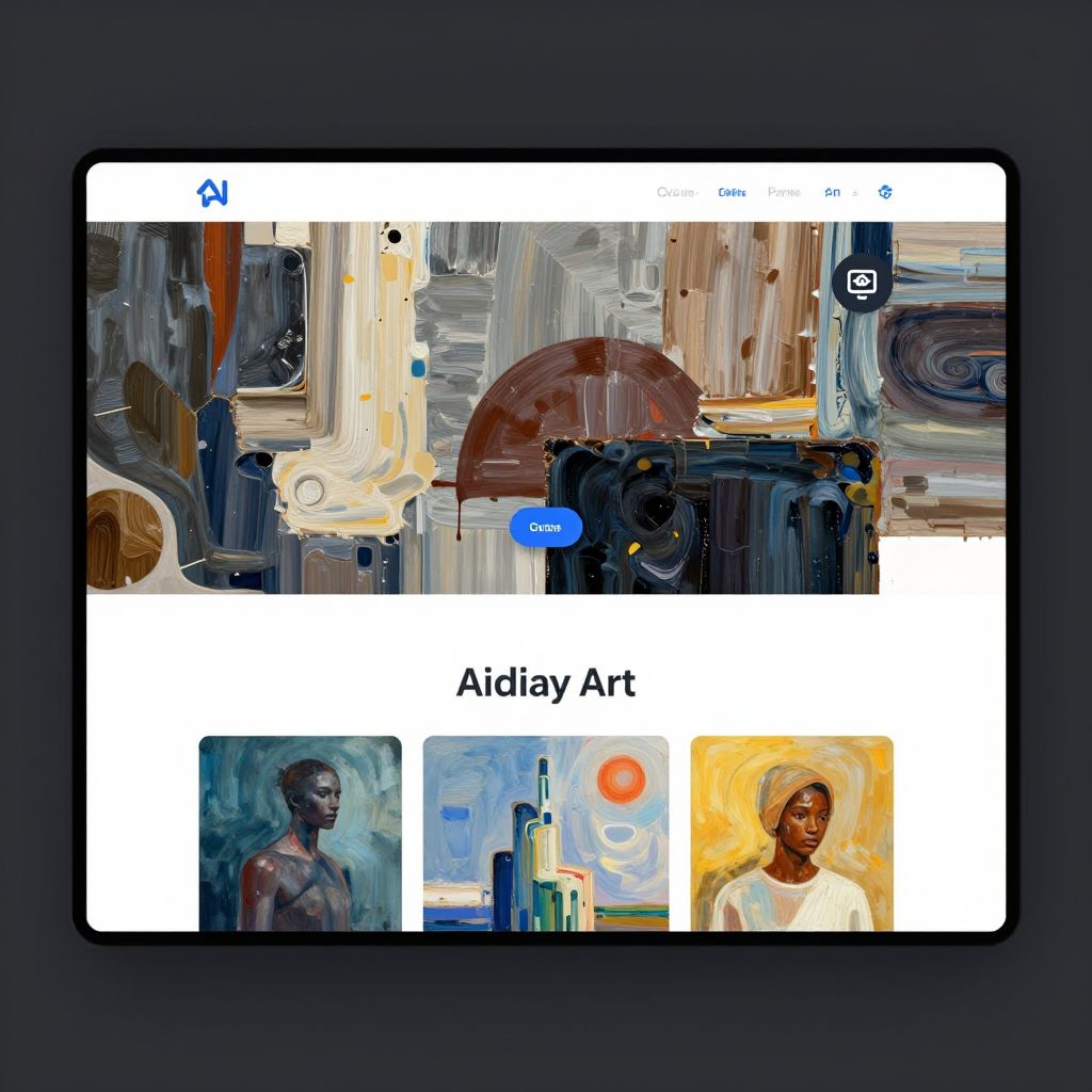 AI art website showcasing an innovative platform for AI-generated mixed media art, featuring seamless video backgrounds of generative brush strokes, intuitive navigation with futuristic icons, dynamic layouts blending organic shapes and tech elements.