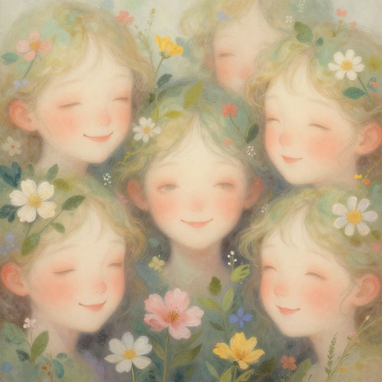 This is a digital painting depicting five smiling, blonde-haired children with closed eyes, surrounded by a lush, colorful array of flowers and greenery. The children's faces are softly blurred, blending into the floral background. Each child has a subtle, content smile, with light pink cheeks. The flowers include white daisies, pink and yellow blossoms, and green leaves, creating a whimsical, dreamy atmosphere. The background is a gentle mix of pastel colors, enhancing the ethereal, gentle feel of the image. The overall style is impressionistic, with a focus on softness and warmth.