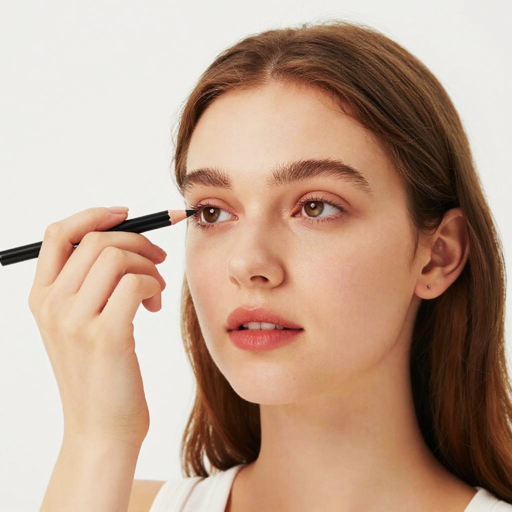 Photograph of a young woman with light brown, straight hair, applying eyeliner with a black pencil to her right eye. She has brown eyes, slightly parted lips with pink lipstick, and a fair complexion. She's looking to the right, with a focused expression. The background is a plain white, making her the clear focus. Her hand is delicately holding the eyeliner pencil near her eye.