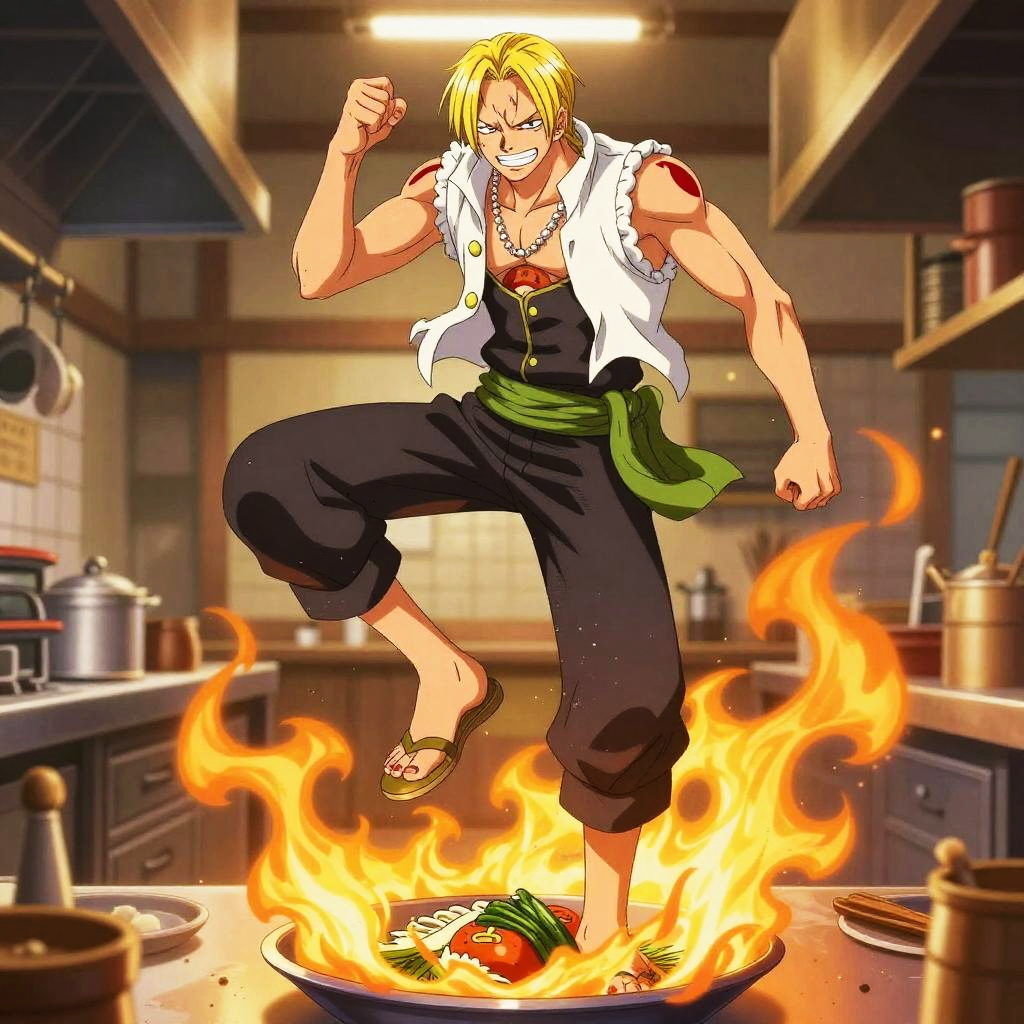 Sanji poses in a bustling kitchen environment, flames bursting from his foot as he prepares a dish, capturing intense anime action with sharp details, bright warm tones, and a sense of motion and determination.