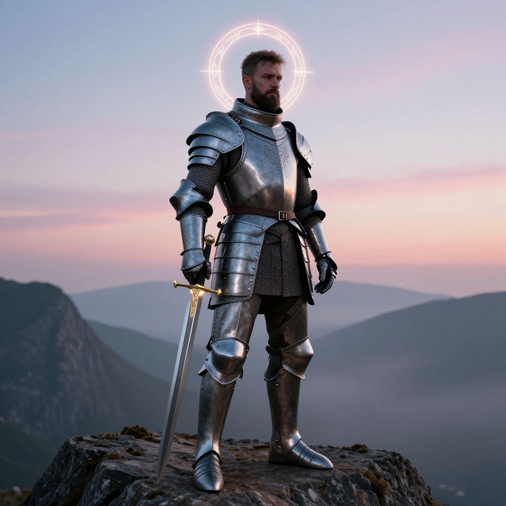 Photograph of a muscular, bearded man in shiny silver medieval armor standing on a rocky cliff at dawn. He holds a glowing sword in his right hand, with a misty mountain landscape in the background. The sky is a soft gradient of pink and blue. A circular, glowing emblem surrounds his head, adding a magical touch to the scene.