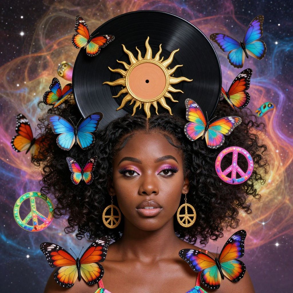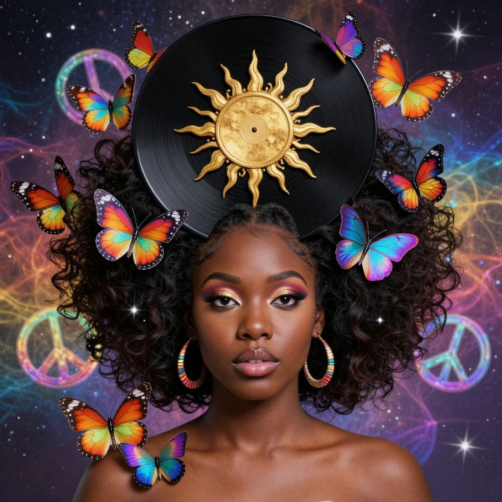 A young Black woman with hair styled like a vinyl record, adorned with a golden sun, is surrounded by a kaleidoscope of rainbow-colored butterflies and peace symbols, creating a dreamlike fusion of music, nature, and cosmic symbolism.