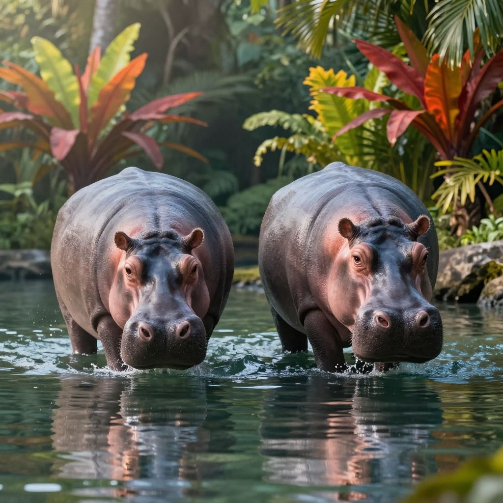 Photograph of two large, dark grey hippopotamuses wading through a clear, reflective water pool in a lush, tropical setting. The hippos are centered in the image, facing forward with their snouts slightly submerged. Surrounding them are vibrant, colorful tropical plants with large, red, green, and yellow leaves. Sunlight filters through the dense foliage, casting soft light on the hippos and creating gentle ripples in the water. The background is a dense jungle with a variety of greenery, adding to the exotic and natural atmosphere.