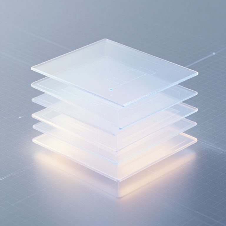 Photograph of a stack of five translucent, white LED light panels, arranged in a pyramid-like formation. The lights are illuminated, emitting a bright white glow with subtle blue and yellow hues. The panels have a clean, geometric design with sharp edges. They are placed on a smooth, reflective, gray metallic surface that has a faint grid pattern. The reflection on the surface adds a subtle blue tint, enhancing the modern and futuristic aesthetic of the image. The overall composition is minimalistic and visually crisp.