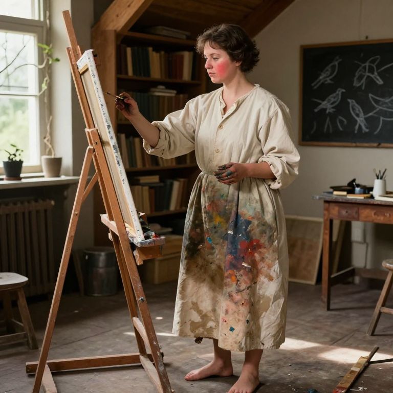 A naturalistic photo of a mid-1930s painter in a practical smock, stained with rich color from oils and watercolors, standing barefoot in a sunlit attic with a canvas stretched on a plank easel; she has a round face with rosy cheeks, a small nose, and a thoughtful look, her hands stained with paint as she carefully applies a new stroke; the background shows old bookshelves, a window with vines outside, and a chalkboard with sketches of birds.