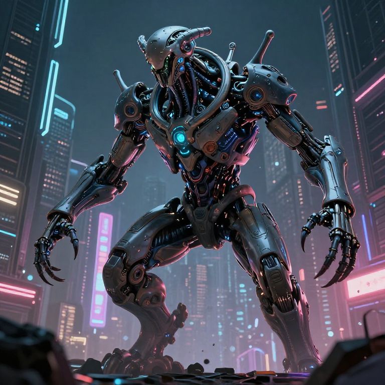 Cybernetic monster with glowing blue eyes and sharp claws stands in a neon-lit, futuristic cityscape, towering over illuminated skyscrapers.