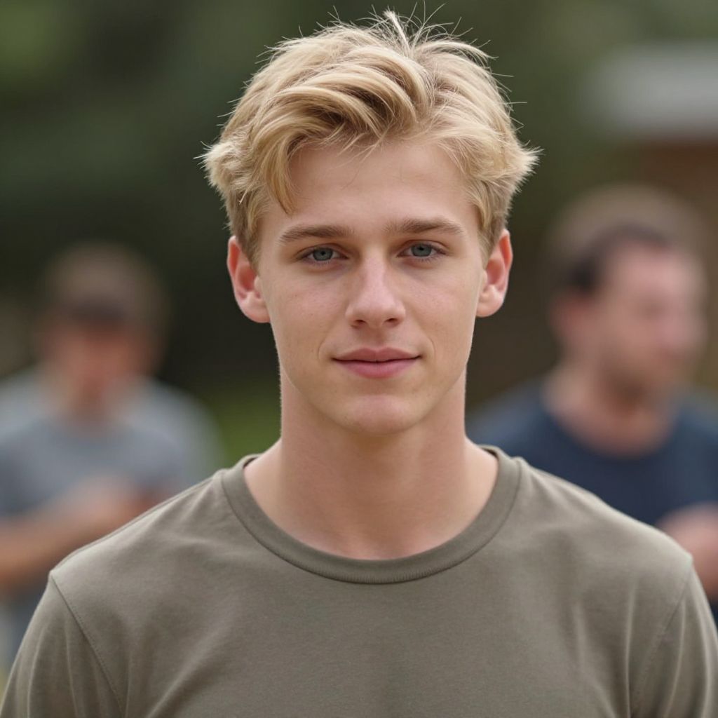 Photograph of a young, fair-skinned man with short, tousled blonde hair and blue eyes. He has light facial hair and is wearing a dark green hooded sweatshirt over a white t-shirt. The background is a plain, solid gray. His expression is neutral, and he is looking directly at the camera. The lighting is even, highlighting his clear skin and subtle facial features. The image is centered and cropped to show the man from the shoulders up.