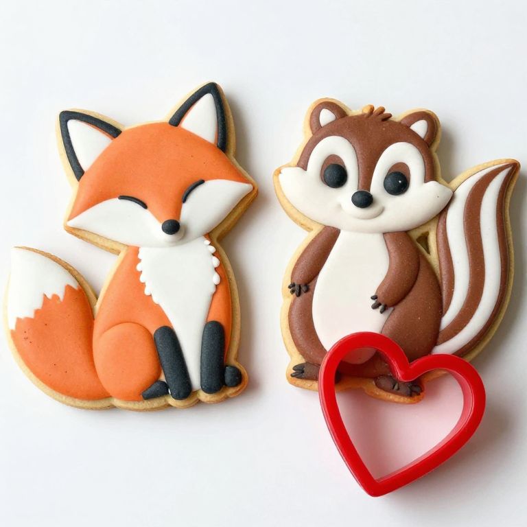 Cute photograph of two decorated animal cookies: an orange fox with white chest and black paws, and a brown squirrel with white belly, sitting next