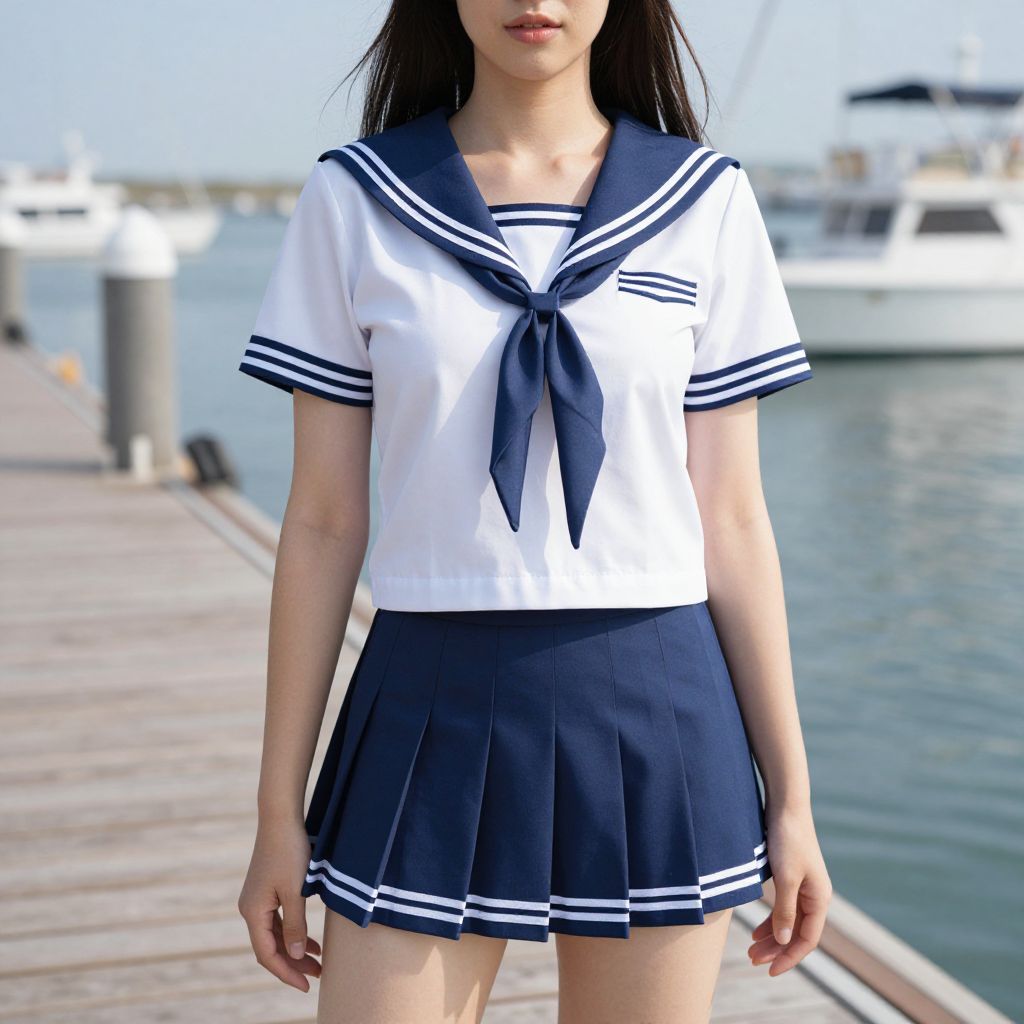 Sailor Costume, woman in sailor outfit standing on a pier with a boat in the background
