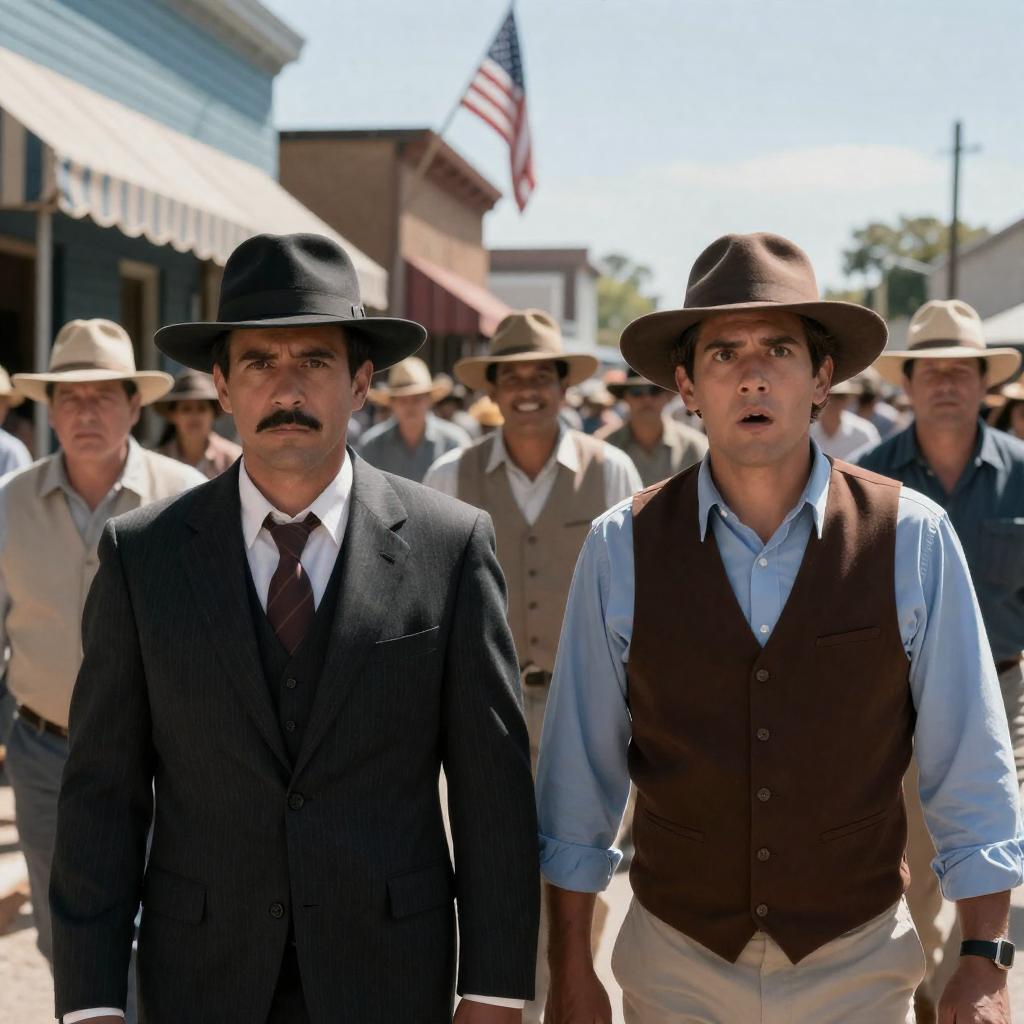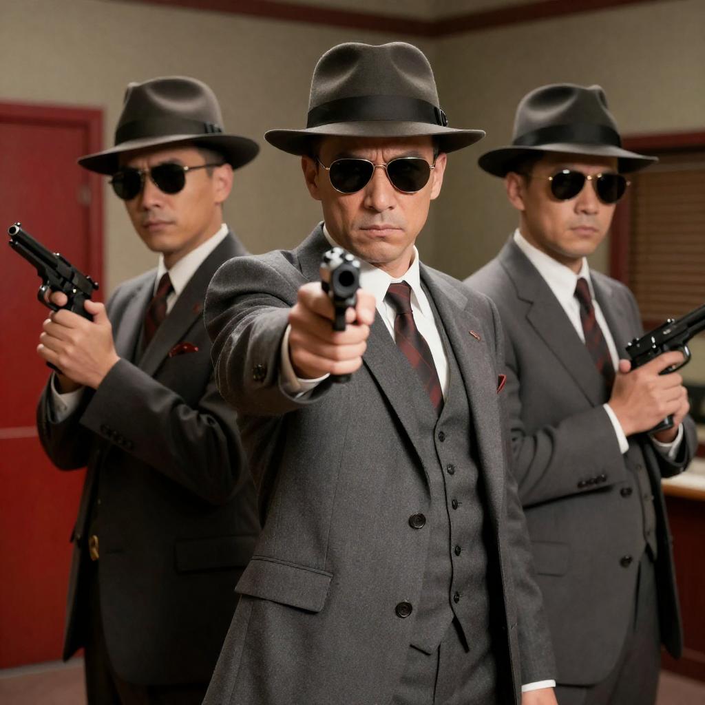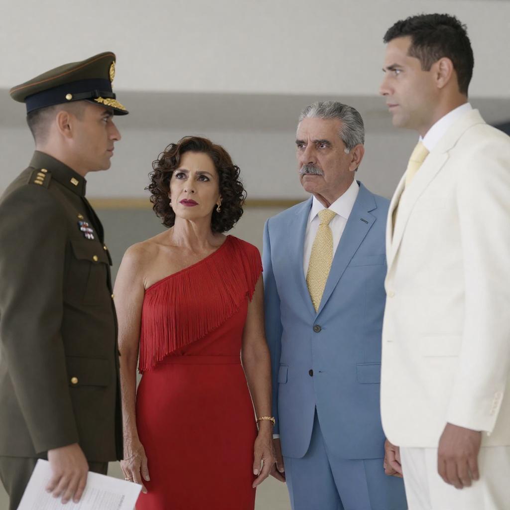 Movie poster of "The Foreign Legion." Three men in white suits and hats stand in front of a richly decorated background. A woman in a yellow sari and headscarf stands to the left. All three men have serious expressions. The woman holds a cigarette. The background has colorful patterns and framed pictures. Three blue-suited men in smaller images are in the lower left corner.