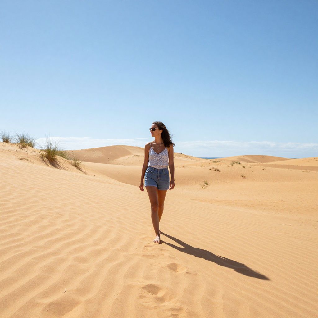 Photograph of a woman with long dark hair, wearing a white patterned top and denim shorts, walking in a bright, sunny desert with golden sand