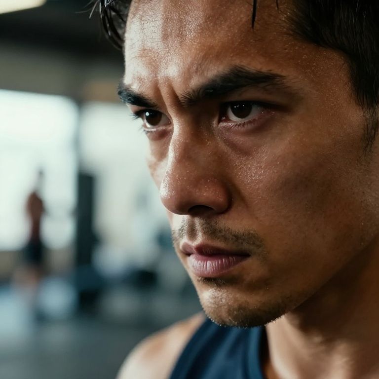 A close-up of a man's face showing determination and emotion, with slight sweat on his brow and a fierce gaze, set against a blurred background of a gym