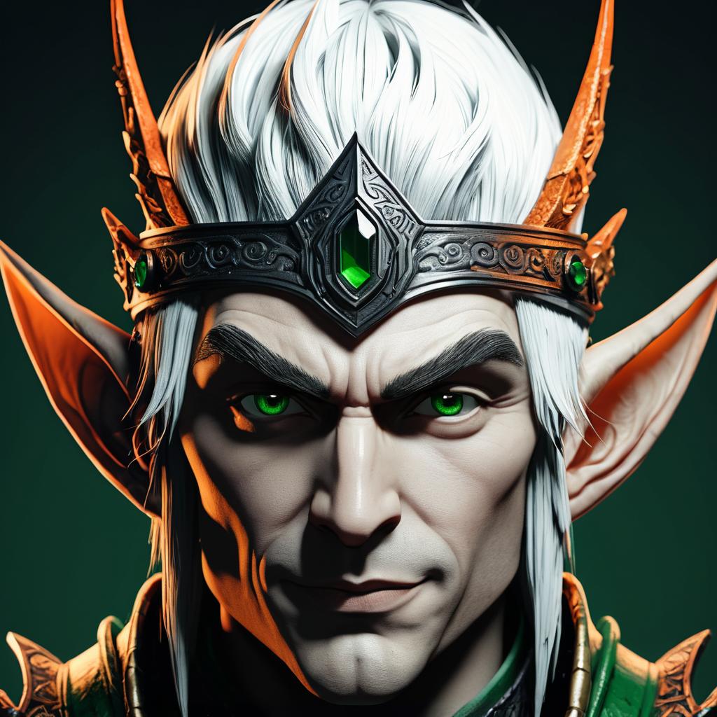 This is a digitally rendered, highly detailed, fantasy-style portrait of an elf with a stern expression. The elf has long, white, straight hair, large pointed ears, and piercing green eyes. He wears an ornate, black metallic crown adorned with a green gem in the center and two orange, horn-like protrusions. His eyebrows are thick and dark, contrasting with his pale skin. He also wears a green garment with golden, spiked shoulder armor. The background is a dark gradient from black to green, highlighting the elf's illuminated face and crown. The image uses a mix of bright and dark colors to create a dramatic, otherworldly effect.