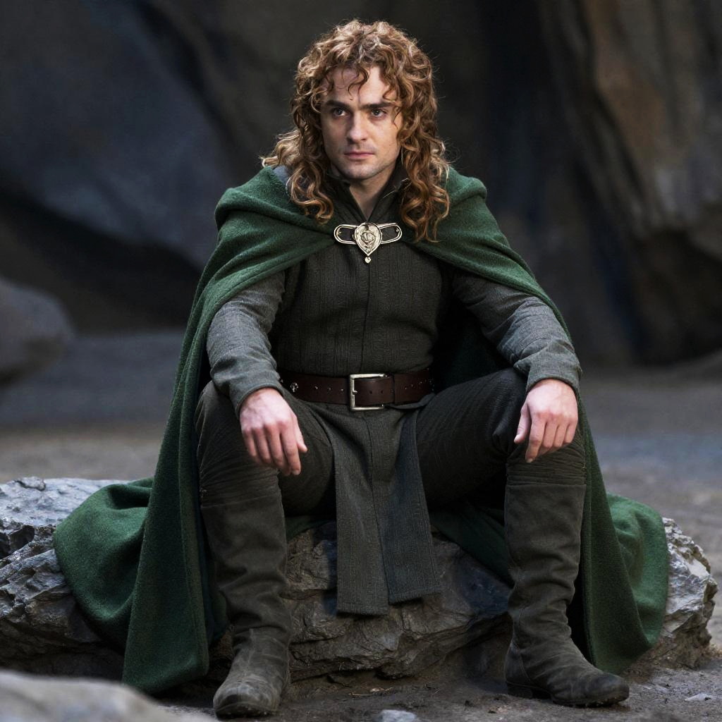 Lord the rings costume male, man in a green cape and brown belt sitting on a rock