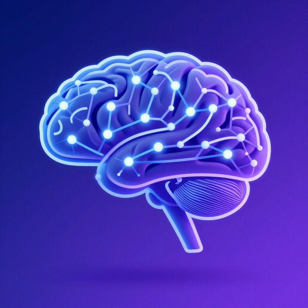 AI clipart featuring a stylized human brain composed of interconnected glowing nodes and lines, symbolizing artificial intelligence and neural networks, minimalist design with blue and purple gradients.