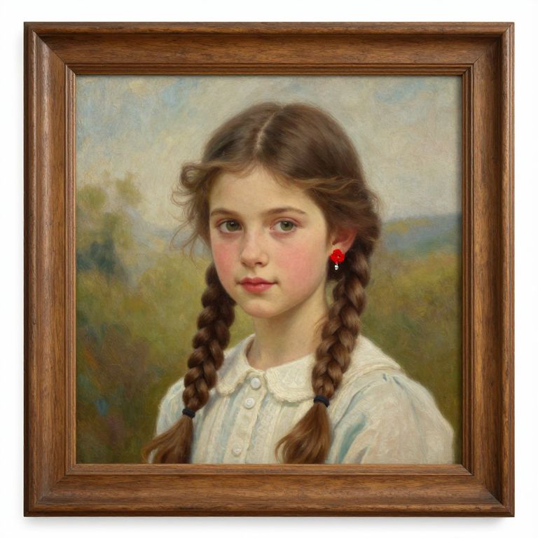 A vintage-style oil painting portrait of a young girl with braided hair adorned with a red flower earring, set against a serene outdoor backdrop, framed in a rustic wooden frame, evoking a classic and nostalgic artistic aesthetic.