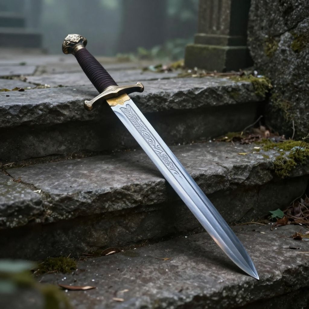 Single edged broadsword with intricate engravings on the blade, resting on ancient stone steps, surrounded by mist and ambient forest light, high-detail fantasy style