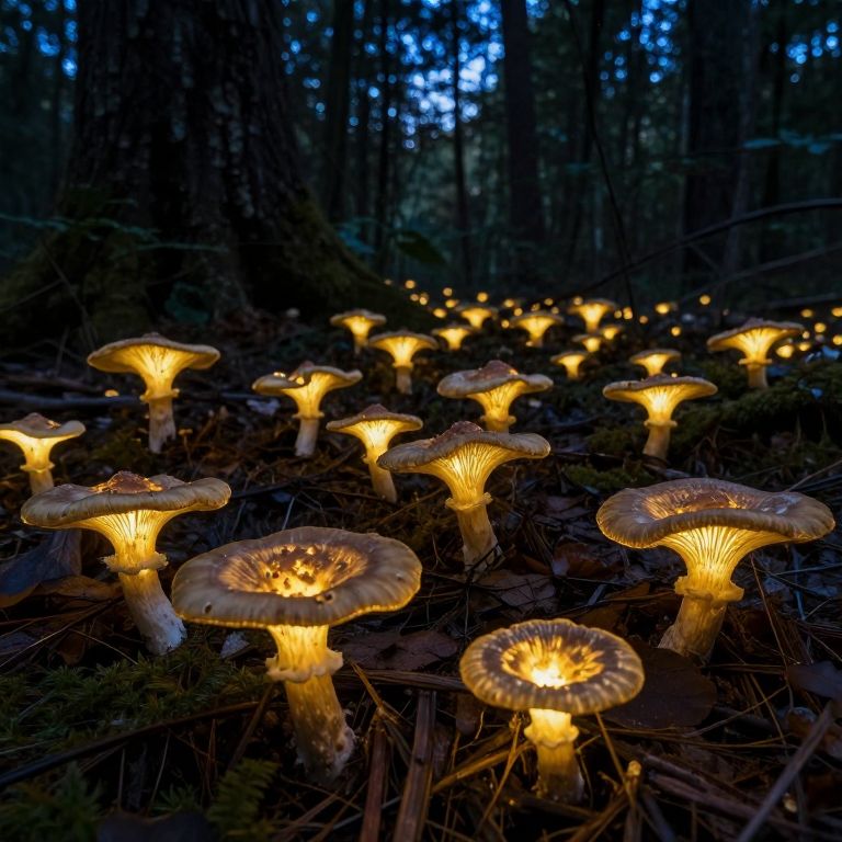 In the enigmatic embrace of twilight, bioluminescent fungi weave a tapestry of ethereal laughter, their golden glow illuminating the forest floor with a whisper of mystery and wonder, while the air hums with the quiet symphony of life's hidden magic.