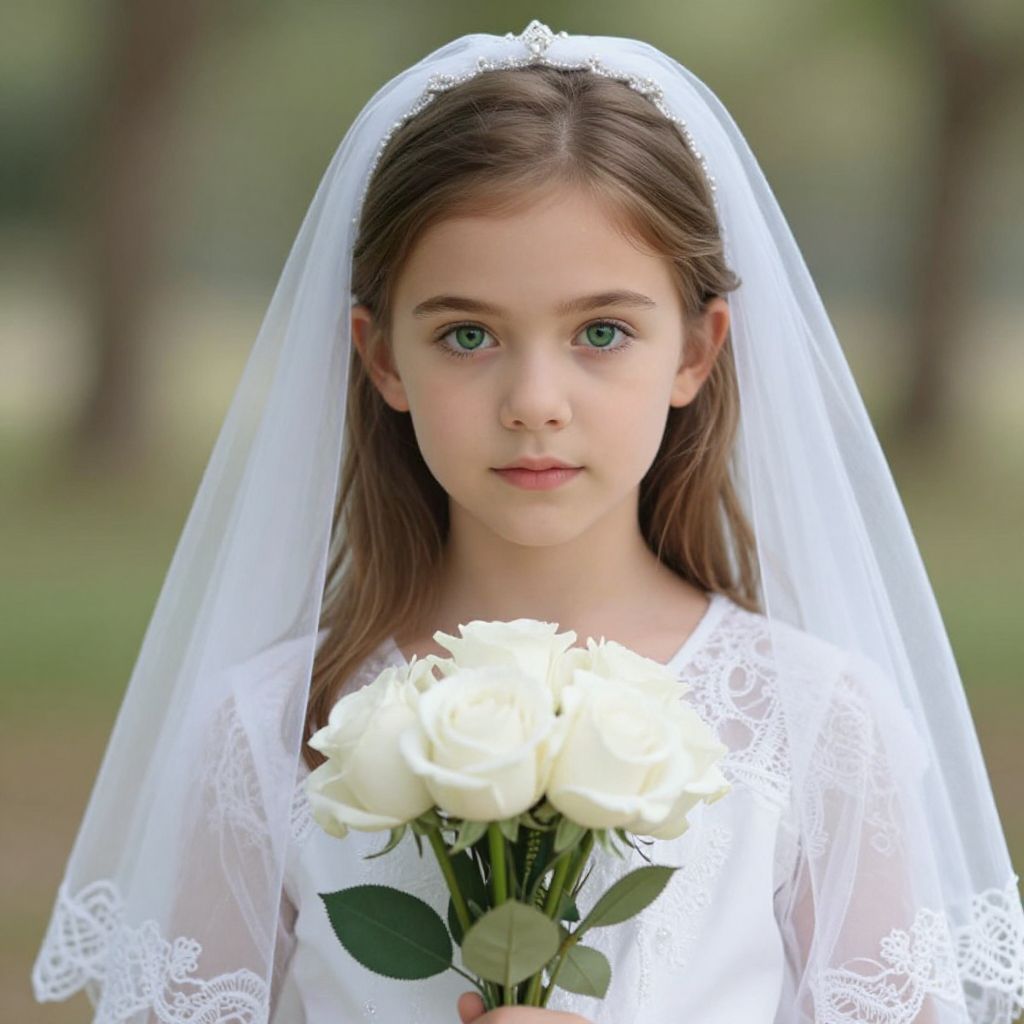 Child fairy godmother, 1girl, solo, dress, veil, brown hair, blurry background, blurry, realistic, looking at viewer, green eyes, flower, white dress, bridal veil