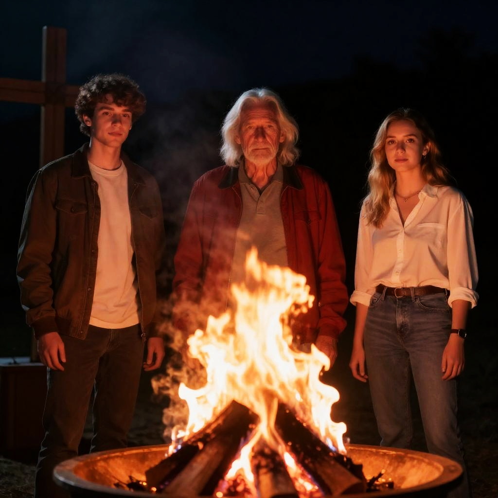 Night scene, three people standing around a large wooden bonfire. Elder man with long white hair and red jacket, center. Young man with brown hair and jacket, left. Young woman with blonde hair and white shirt, right. Flames brightly illuminate their faces. Wooden cross on left. Dark background with faint tree silhouette.