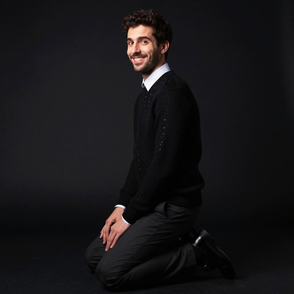 Portrait of a 27-year-old Jewish man, kneeling and looking back with a smile, in the style of Yayoi Kusama, Lee Krasner, dark artistic strokes, pure black background, photorealistic studio lighting, high resolution