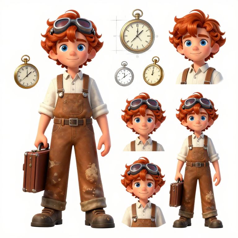 This is a digital 3D cartoon-style image of a young boy with curly red hair, blue eyes, and a cheerful expression. He wears brown, worn-out overalls over a white shirt, brown boots, and aviator goggles on his head. He holds a brown briefcase in his right hand. The background is white with six smaller, identical versions of the boy's head and torso arranged around three pocket watches. The pocket watches are positioned between the boy's head and torso images. The boy's overalls have visible rips, adding a rugged, adventurous appearance. The overall style is reminiscent of animated children's films.