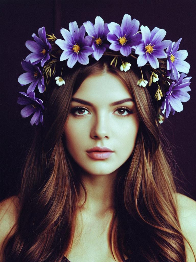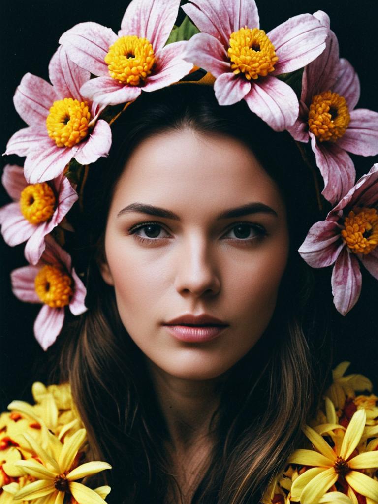 Woman in Flower Costume, close-up detailed headshot, photorealistic realism