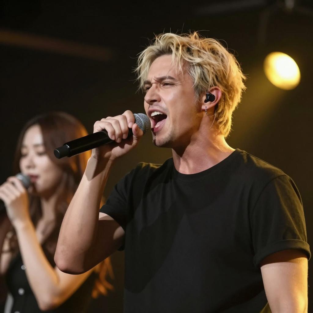 Male singer with blond, slightly messy hair, black t-shirt, holding microphone, mouth open in mid-scream. Female singer with long brown hair in background, partially visible, making hand gesture. Dimly lit stage with dark, blurred background and yellow stage lights. Two people.