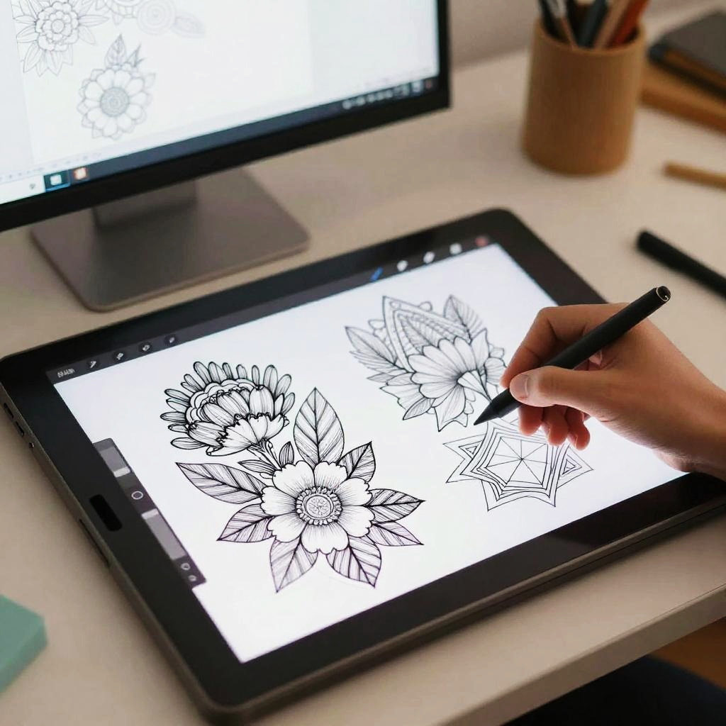 Creative lineart maker environment featuring a desktop with stylus and digital sketchpad, sketch of floral and geometric patterns emerging in fine line style, soft natural lighting from window, cozy artistic studio setting, vibrant but subtle color accents.