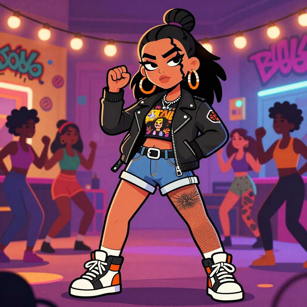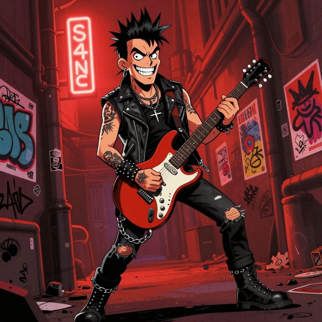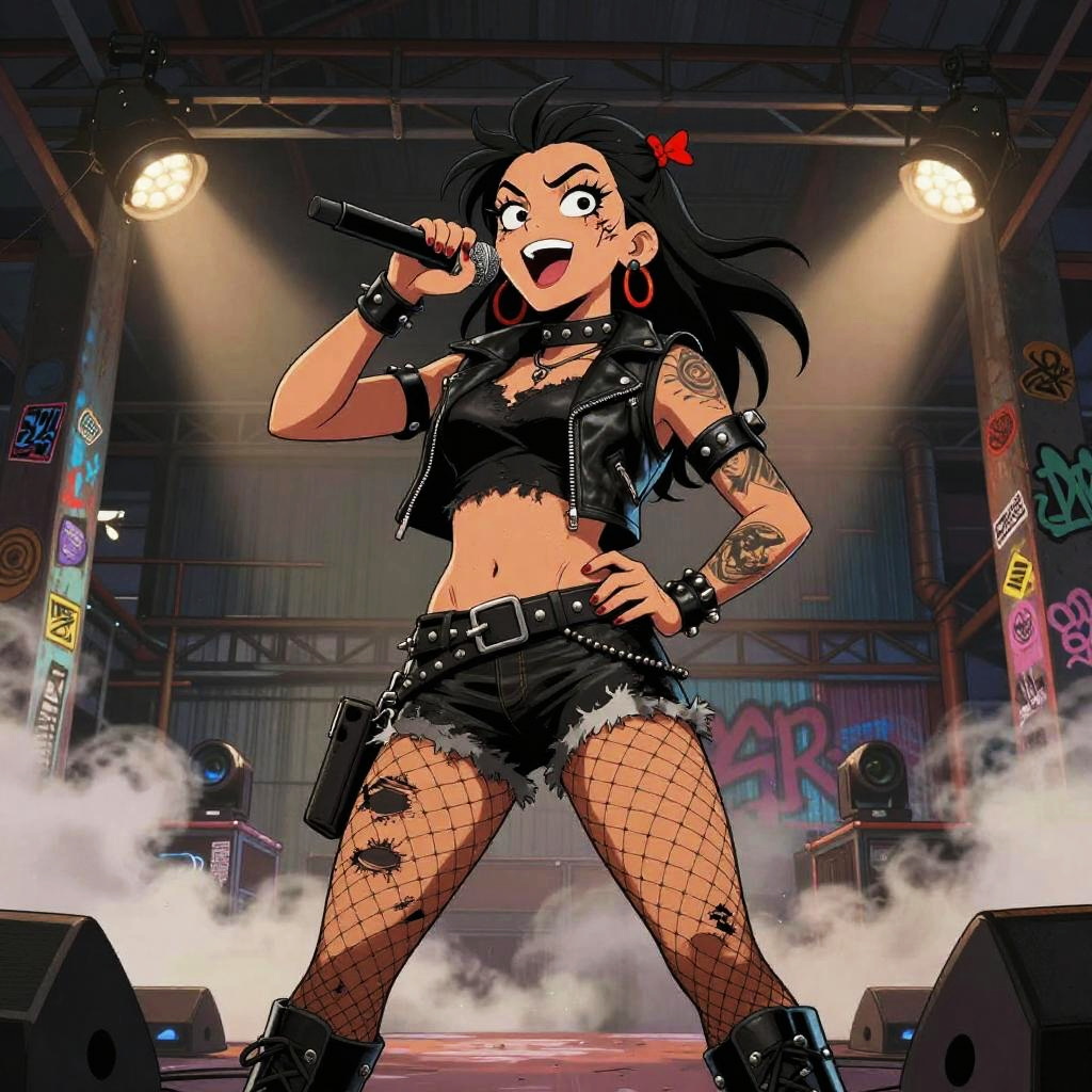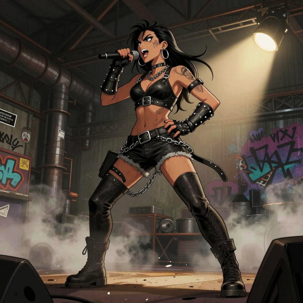 Reimagined cartoon antihero as a bold Eastern European female industrial metal vocalist at factory warehouse stage with smoke and exposed steel beams, rendered in raw comic style with heavy textures, aggressive shading, and muted palette; intense fierce attitude; detailed clothing and accessories (leather harness, riveted gloves, combat boots, silver chains); dynamic pose with dramatic side lighting; graffiti tags and stickers on walls; desaturated colors and strong contrasts; rough linework and grainy textures; harsh spotlight and subtle smoke effects; shallow depth of field; digital illustration; ultra-detailed urban vibe.