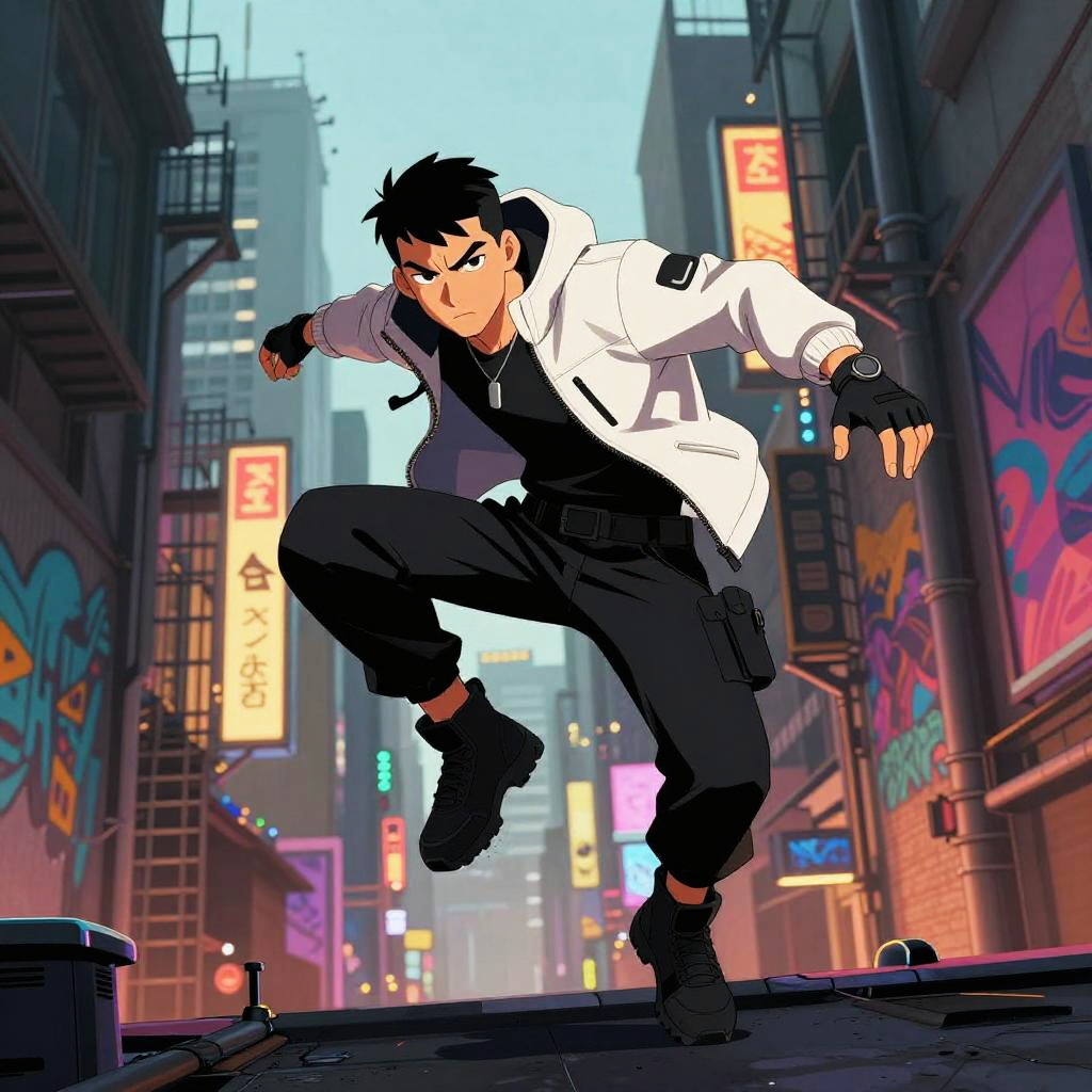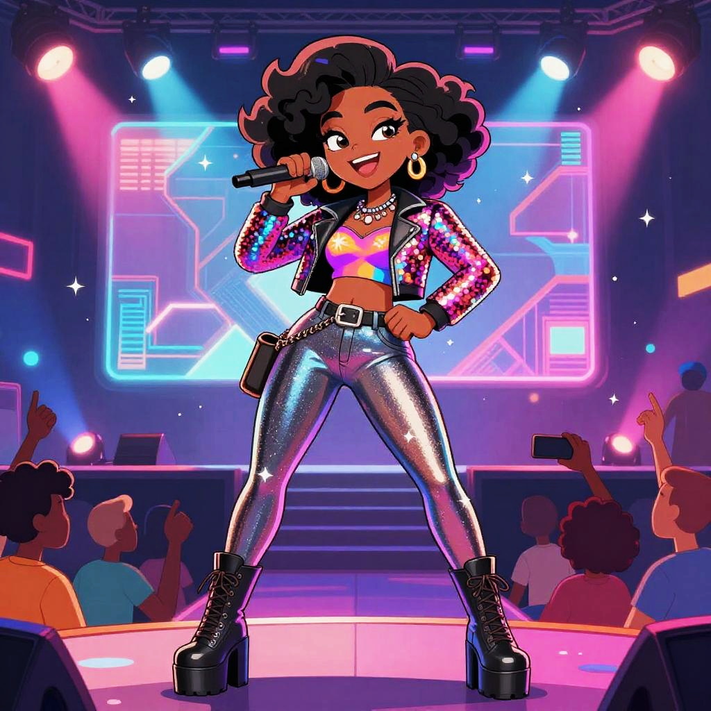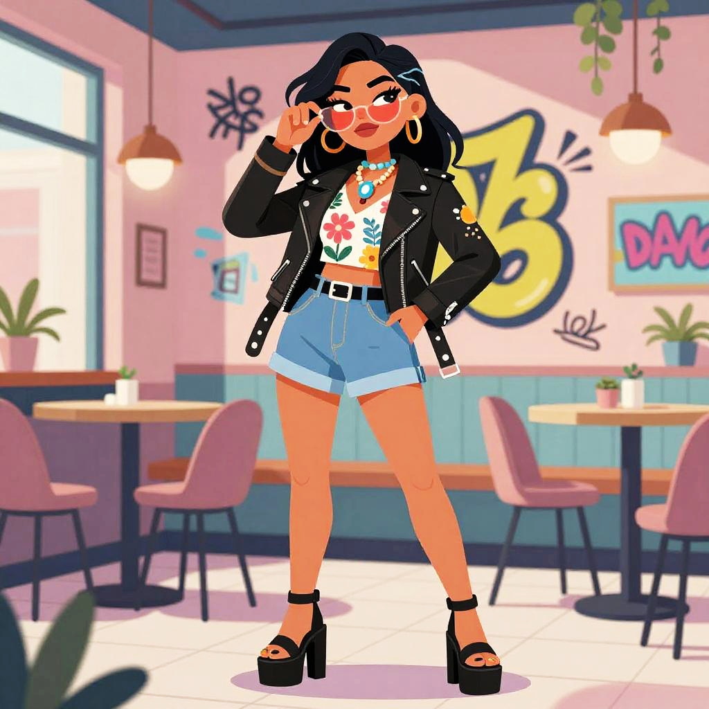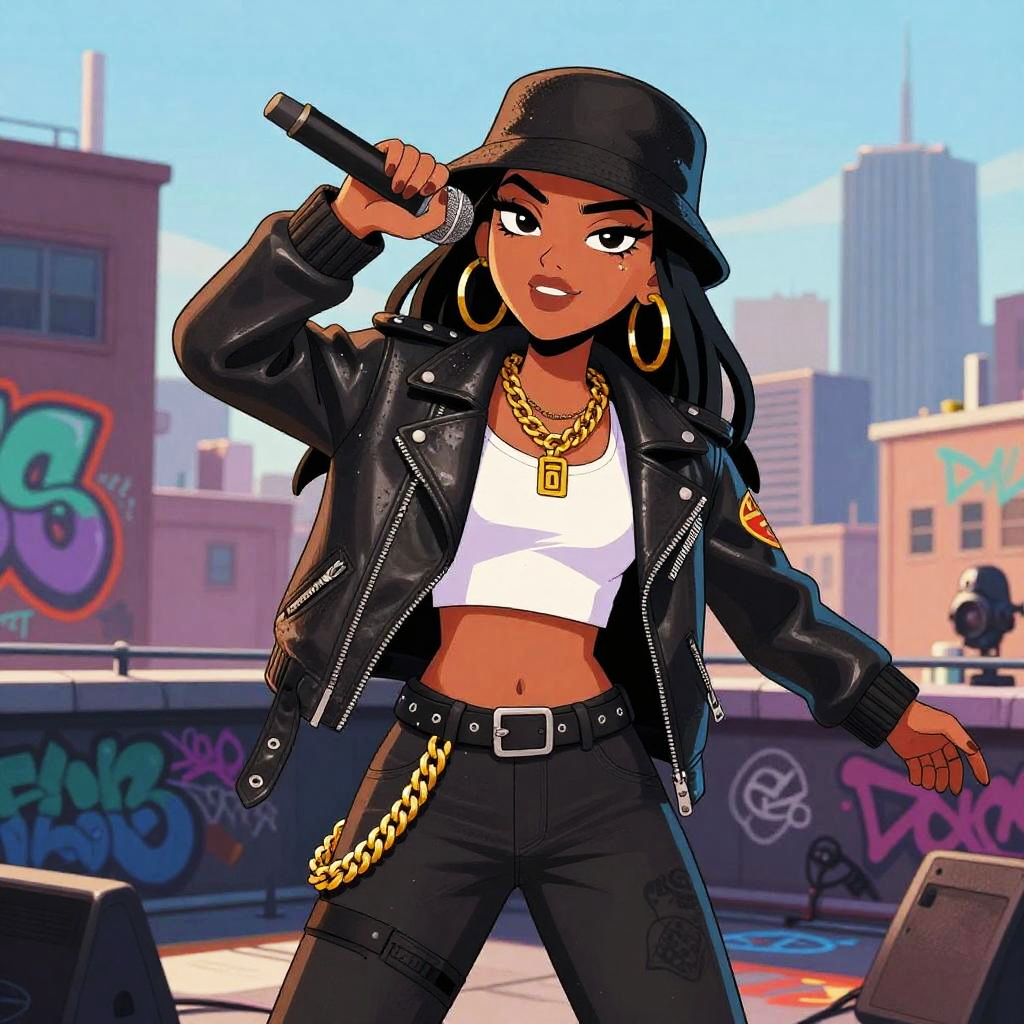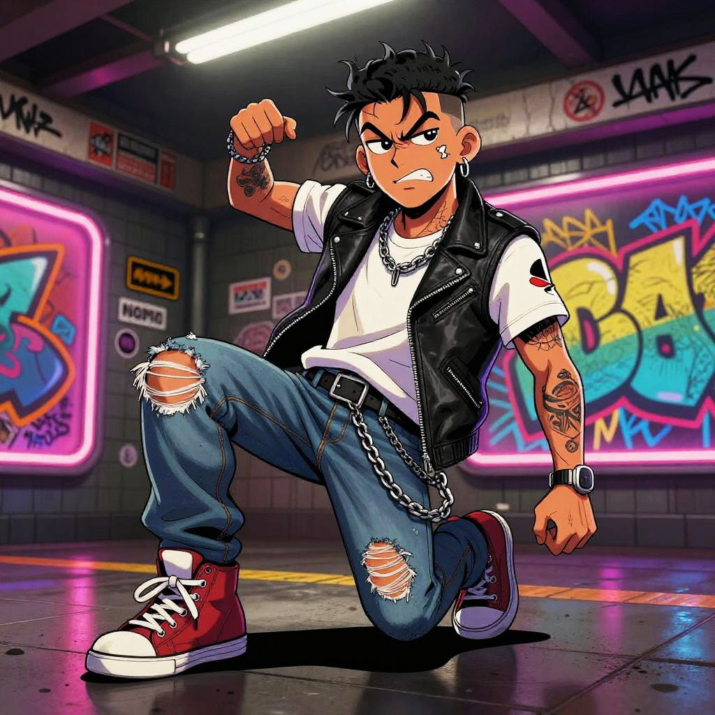Reimagined cartoon antihero as a bold Eastern European female industrial metal vocalist at factory warehouse stage with smoke and exposed steel beams, rendered in raw comic style with heavy textures, aggressive shading, and muted palette; intense fierce attitude; detailed clothing and accessories (leather harness, riveted gloves, combat boots, silver chains); dynamic pose with dramatic side lighting; graffiti tags and stickers on walls; desaturated colors and strong contrasts; rough linework and grainy textures; harsh spotlight and subtle smoke effects; shallow depth of field; digital illustration; ultra-detailed urban vibe.