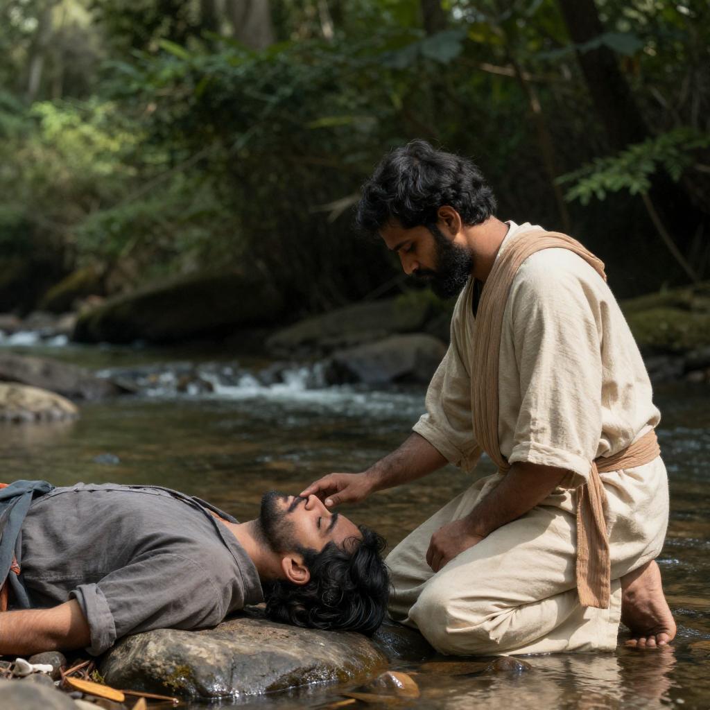 Man with dark hair and beard, wearing beige robe, kneels by river, holding stick, touching unconscious man's forehead. Unconscious man has dark hair, gray clothing, lies on rocky riverbank. Dense green forest in background. Sunlight filters through trees.