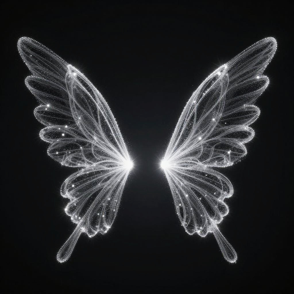 A pair of delicate abstract wings made of flowing particles and glowing white dots, floating in a dark space, high contrast between light and shadow, intricate and ethereal digital composition