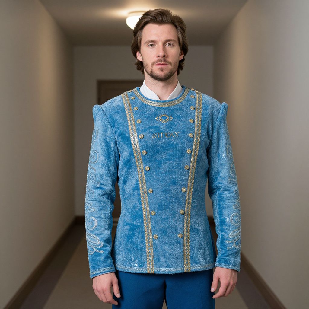 Photograph of a white man with wavy brown hair and a short beard, standing in a dimly lit, narrow hallway with white walls and a dark wooden baseboard. He wears a blue, ornate, long-sleeved jacket with gold buttons and intricate white embroidery along the edges and chest. The jacket has a slightly puffed, Renaissance-style cut, and he pairs it with plain blue pants. The man stands centered, facing the camera with a neutral expression. The hallway is illuminated by a single, overhead light fixture. The image has a slightly surreal, digitally enhanced quality.