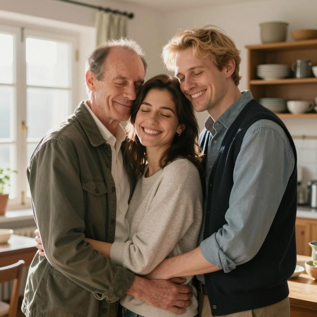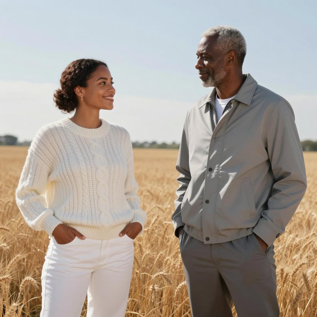 Photograph of a man and woman. Man has short gray hair, wearing a dark suit, white shirt, and black tie. Woman has curly brown hair, wearing a white tank top, with large hoop earrings. Woman's arm around man's shoulder, faces close together, both smiling slightly. Background is plain white. Man on the left, woman on the right.