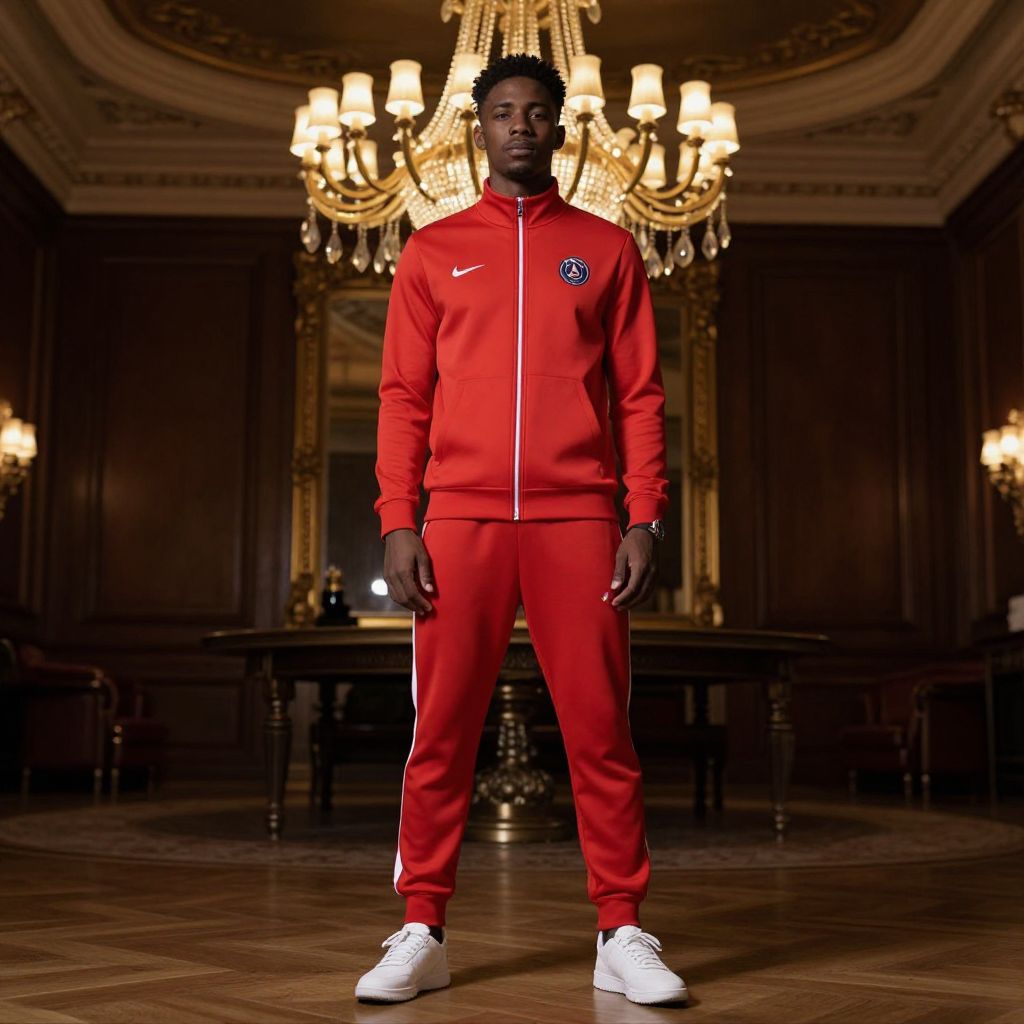Psg Tracksuit Costume, man in red tracksuit standing in front of a chandelier
