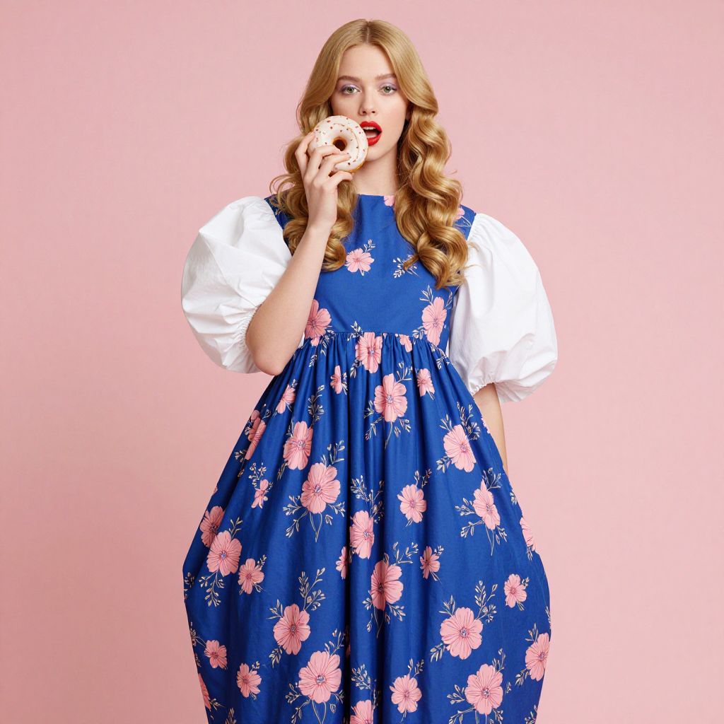 Photograph of a fair-skinned woman with long, wavy blonde hair, wearing a blue dress with pink floral patterns and white puffed sleeves. She holds a donut with red icing to her lips, her red lipstick matching the donut's color. The background is a solid pink, creating a soft, pastel contrast with her outfit. The dress's skirt is full and flowy, adding volume to her silhouette. The overall style is vintage-inspired with a modern twist, emphasizing a playful and feminine aesthetic.