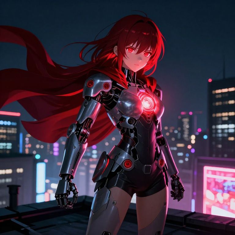This digital anime-style illustration depicts a red-haired, glowing-eyed woman standing on a rooftop at night. She wears a sleek, black, robotic bodysuit with red circular emblems on her chest and shoulders. A red cape flows dramatically behind her. The background features a cityscape with brightly lit skyscrapers and neon signs. The woman's robotic limbs and glowing eyes add a futuristic, superhero-like aura. The colors are vivid, with dominant reds, blacks, and blues, and the lighting emphasizes her figure against the dark night sky.