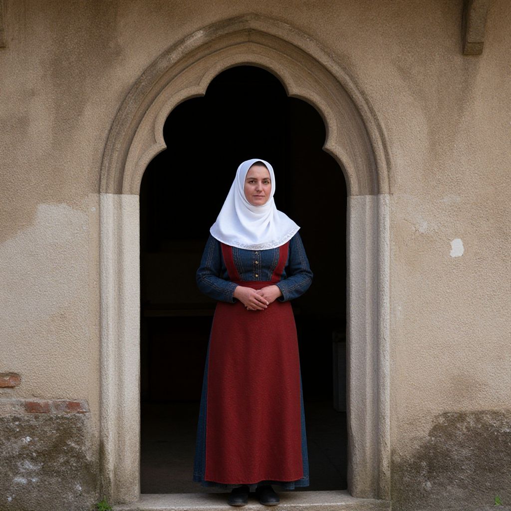 Photograph of a solemn nun in a black dress and white headscarf standing in a stone arched doorway, with a darkened interior behind her